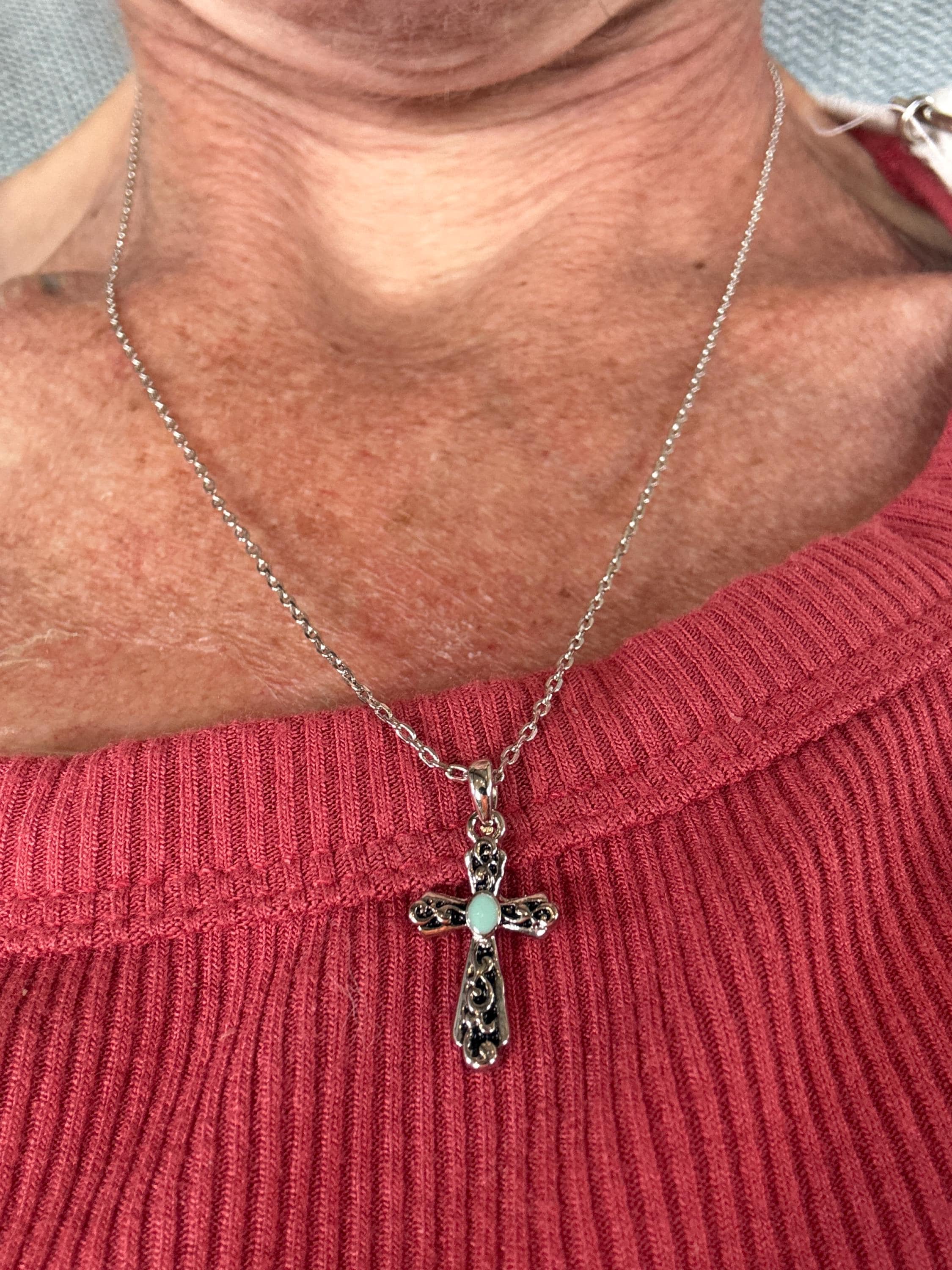 Gothic Cross with Vines and a Milky Mint Turquoise Enamel filled oval point, necklace is inspired by the classic rustic styles. This pendant features an intricately designed antique cross, dipped. The pendant comes with a matching gold chain that complements its vintage appeal, making it a versatile accessory suitable for any occasion.
