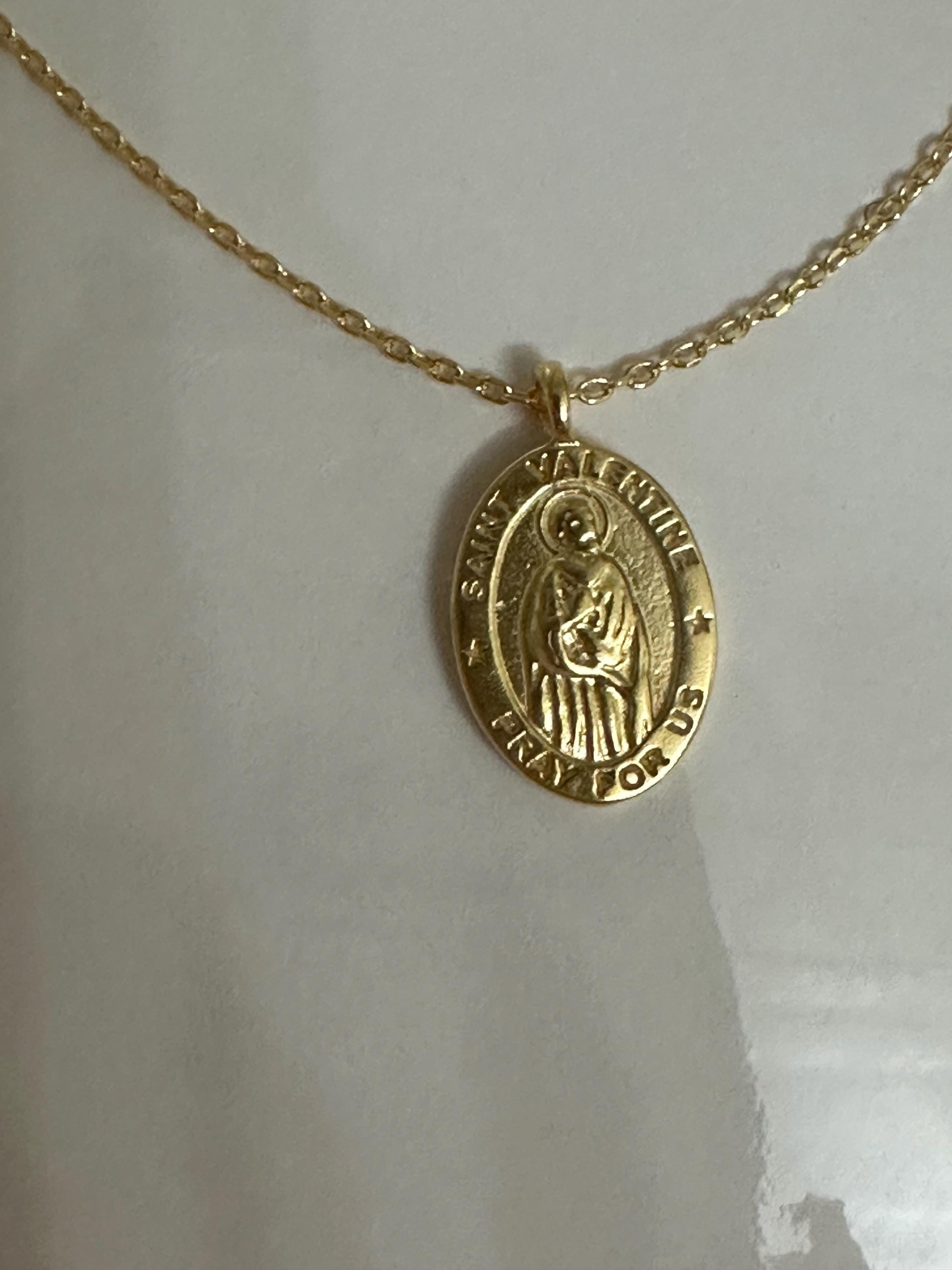 Beautiful miraculous medal with St. Valentine. Perfect gift for my daughter. The medal comes with a matching gold chain to add to the elegance. Very dainty, just like my daughter. Perfect gift for her. Highly recommend.
